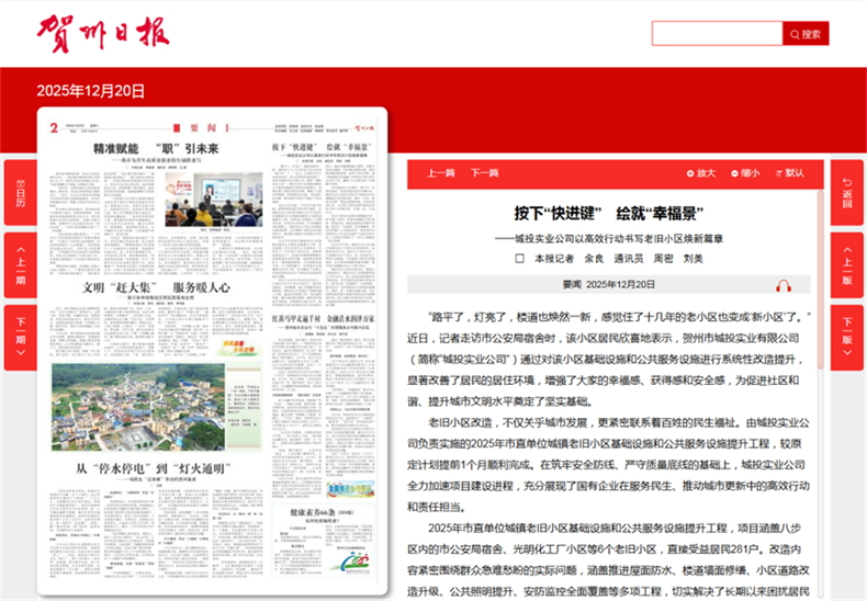 發(fā)布時(shí)間:2025-12-22 作者:文字:賀州日?qǐng)?bào) 來源:本站原創(chuàng) 審核:“路平了,燈亮了,樓道也煥然一新,感覺住了十幾年的老小區(qū)也變成‘新小區(qū)’了。”近日,記者走訪市公安局宿舍時(shí),該小區(qū)居民欣喜地表示,賀州市城投實(shí)業(yè)有限公司(簡稱“城投實(shí)業(yè)公司”)通過對(duì)該小區(qū)基礎(chǔ)設(shè)施和公共服務(wù)設(shè)施進(jìn)行系統(tǒng)性改造提升,顯著改善了居民的居住環(huán)境,增強(qiáng)了大家的幸福感、獲得感和安全感,為促進(jìn)社區(qū)和諧、提升城市文明水平奠定了堅(jiān)實(shí)基礎(chǔ)。